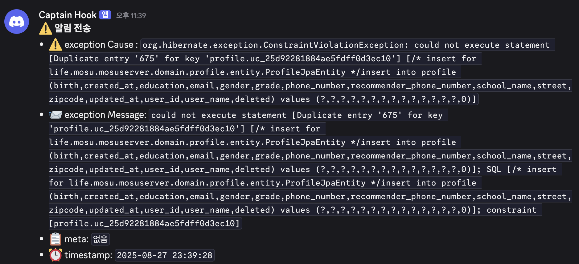 2025년 8월 27일 갑작스럽게 처음 보는 에러가 발생했습니다. DB JoinColum에서 중복되는 Id 입력의 시도가 발생했고, 트러블 슈팅을 진행하였습니다.