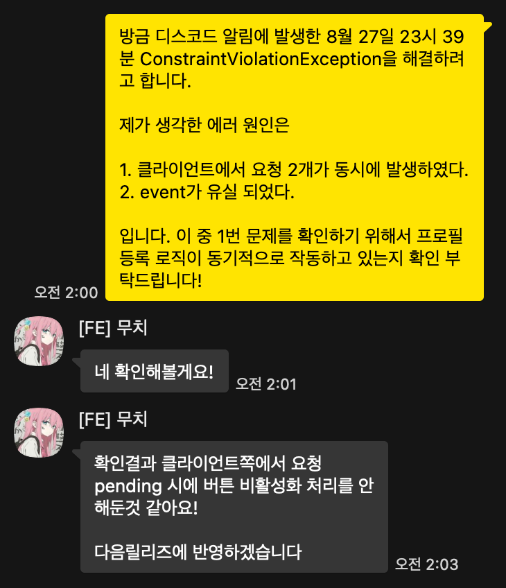 코드를 보고 추상적으로 profile 등록 로직이 event로 발행되어서 event가 유실될 수 있지 않을까? 클라이언트에서 요청이 동시에 2개가 들어와서 동시성 이슈가 발생하지 않을까라는 생각이 들었습니다.